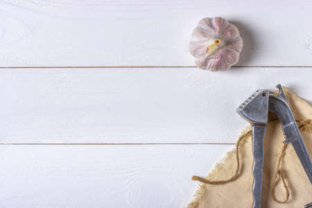 Garlic with garlic press on white wooden background and cloth
