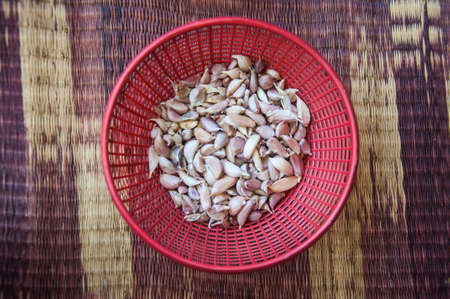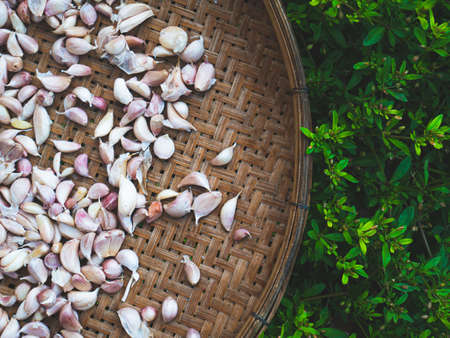 Top view. Garlic placed on a wooden tray to be dried in the sun.