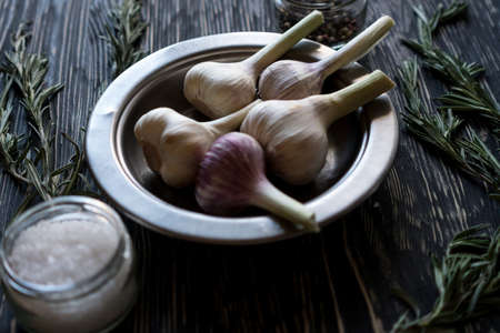 Rosemary, garlic, salt - culinary background.