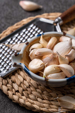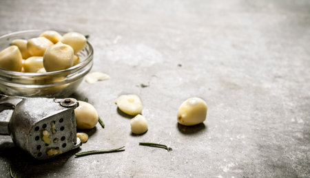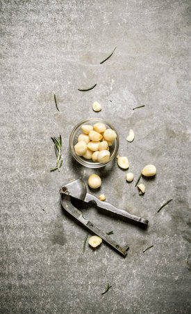 Peeled garlic in a glass bowl and press garlic. On a stone background.