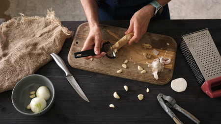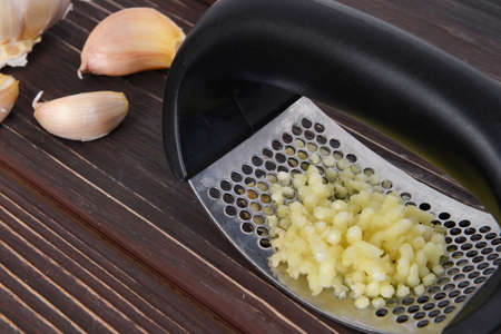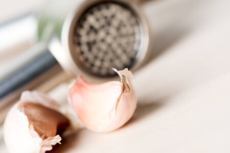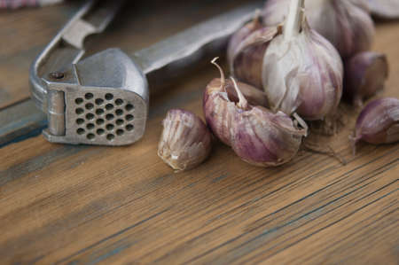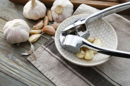 Fresh Garlic Preparation with Press on Wooden Table
