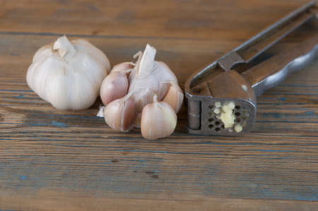 garlic head bulb and garlic presser on wooden rustic background