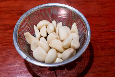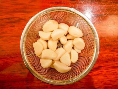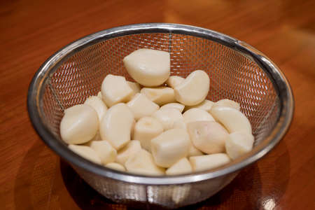 Peeled garlic in a stainless steel collander on a wood surface with selective focus point