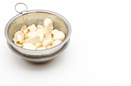 Peeled garlic in stainless steel colander on a white background