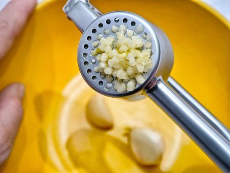 Minced garlic is freshly extracted from a stainless steel garlic press into a bright yellow bowl, ready for cooking or seasoning.