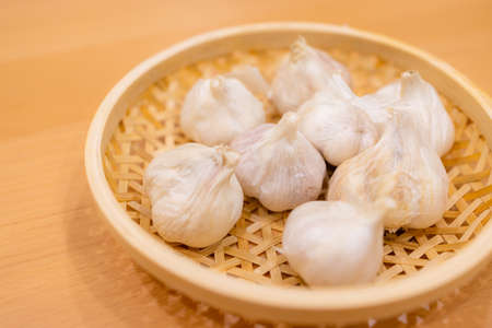 Fresh garlic bulbs or lasun on wooden surface along with some fried garlic cloves in small plate.Used to treat cholesterol.