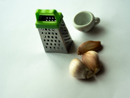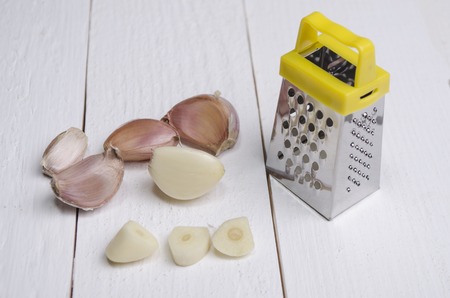 garlic on a wooden background with a grater