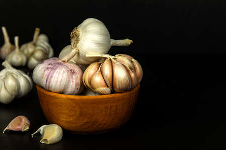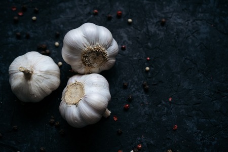 Fresh and healthy garlic on a black kitchen table. A healthy natural antibiotic for colds. Dark background.