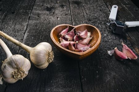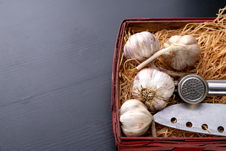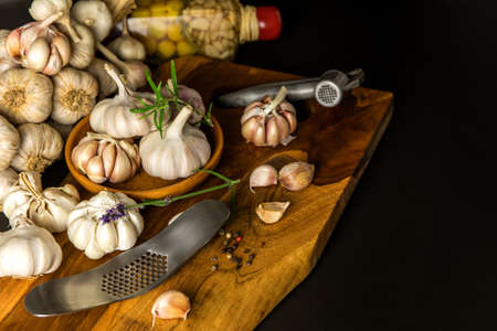 Cloves of garlic on a wooden black table. Fresh garlic bulb with iron garlic press. Vintage background. Farmer. Medicine and healthy. Traditional medicine.