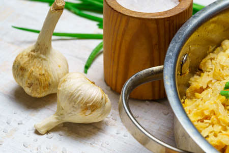 fried chopped cabbage in a frying pan, garlic and green onions, raw and cooked food in a rustic style on a background of white wooden boards