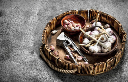 Fresh garlic in bowls with a press tool on a wooden tray. On a rustic background.