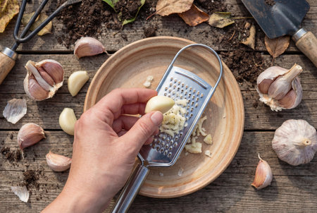 Hand grating fresh garlic clove into bowl on rustic wooden table surrounded by gardening tools, soil and autumn leaves representing farm to table concept