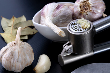 Garlic bulbs and garlic press on wooden table. Black background.