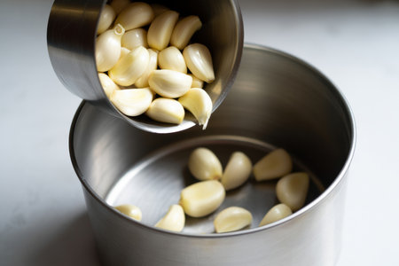 Fresh garlic cloves being poured from a metal measuring cup into a stainless steel pot on a white kitchen counter.