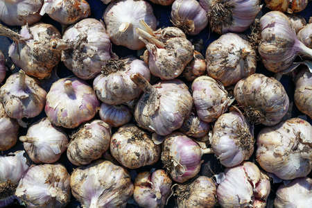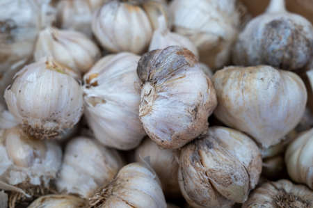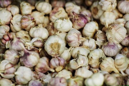 Pile of many fresh garlic in the farmers market for sale from field for background. Close up