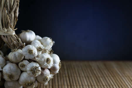 Garlic in a wicker basket on a wooden table background. Copy, empty space for text.