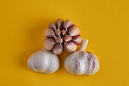 Garlic bulb and garlic cloves on a fifth yellow background. Top view, flat lay.