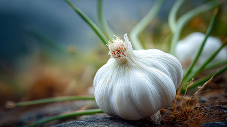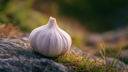 Fresh garlic bulb resting gracefully amongst vegetation in a natural setting