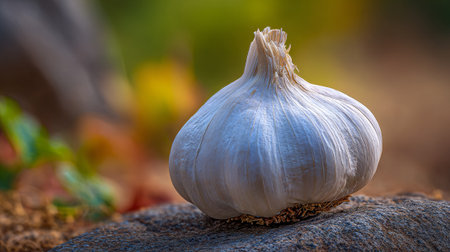 Single garlic bulb on rustic stone surface with blurred greenery background