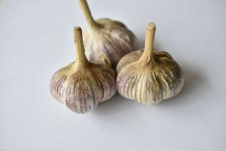 Closeup of garlic bulbs isolated on white background.