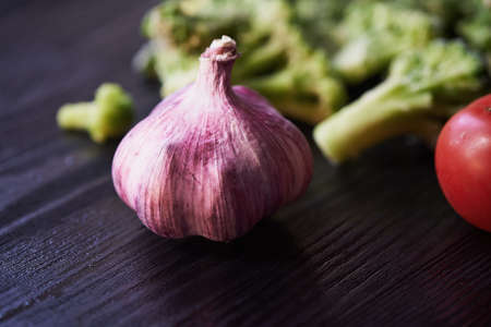 Broccoli, tomatoes and garlic lying on a dark background. Healthy eating.Vegetarianism. Fresh vitamins