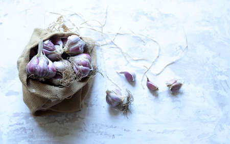 garlics in sack cloth bag decorated in vintage style