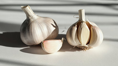 There are three garlic heads on a white background, two whole and one clove. The shadows cast by the blinds create an interesting visual effect, emphasizing the texture and shape of the garlic