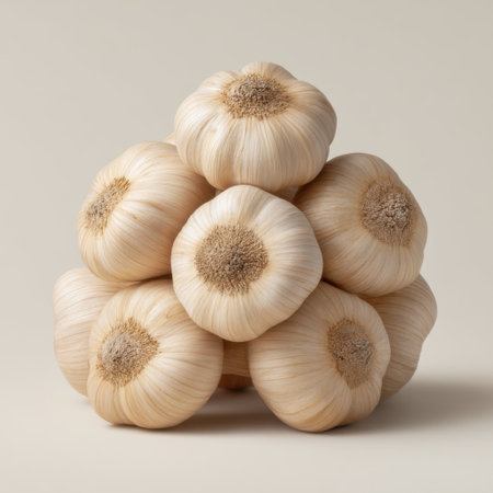 A visually appealing arrangement of fresh garlic bulbs stacked on a soft beige background, perfect for culinary, health, and food-related themes. The image captures the natural beauty and simplicity of garlic.
