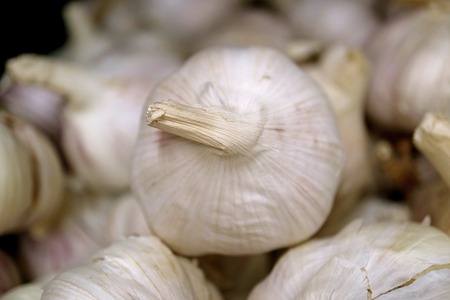 Closed up one of a raw garlic on the garlic pile