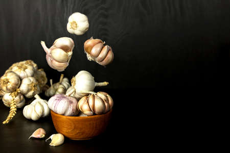 Pile of whole bulbs of garlic in ceramic bowl on table. Harvest of unpeeled vegetables on black background