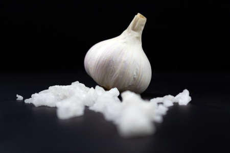 Organic garlic, salt close up. Black background