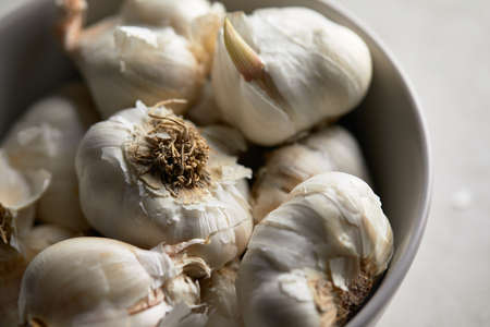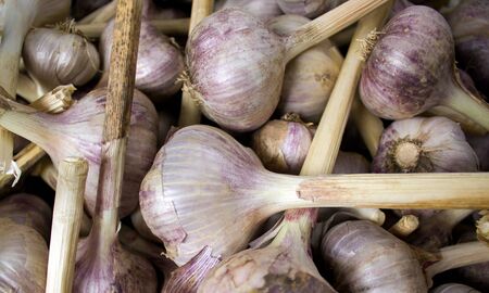 Organic vegetables background, many dried white garlic bulbs