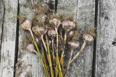 Top view of bunch freshly uprooted dirty and ripe ecological garlic heads with stalks on dry and grey planks background