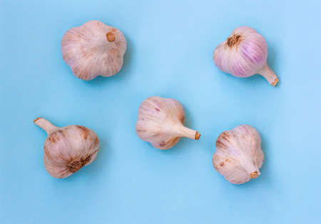 Five large heads of garlic lie on a blue background, Flatley