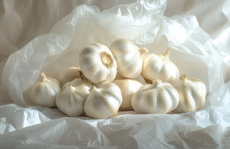 Stunning product photography showcasing garlic bulbs in a clear plastic bag on white background