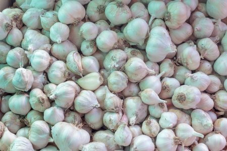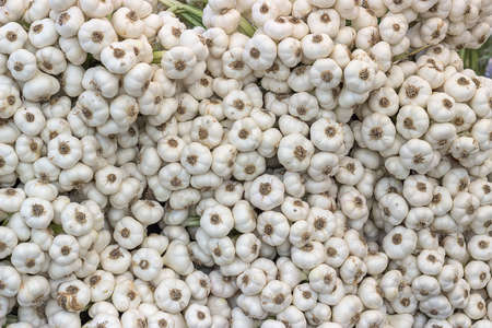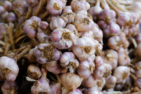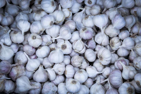 Garlic bulbs background in farmer market. Allium sativum background. Selective focus and shallow dof.