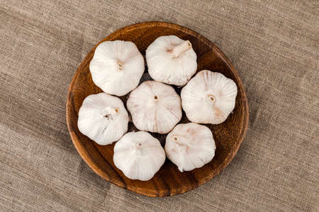 Garlic cloves in wooden plate on burlap background.