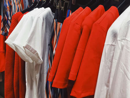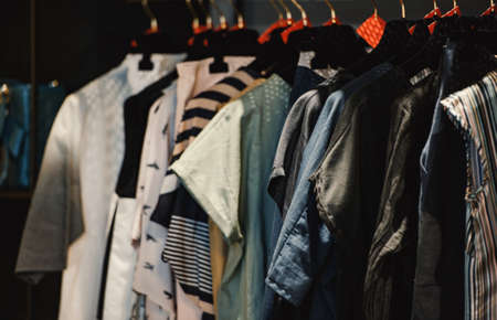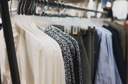 Shopping in store. Clothes on hangers in shop for sale. Blur background. Fashionable clothes in a boutique. Various clothing on market.