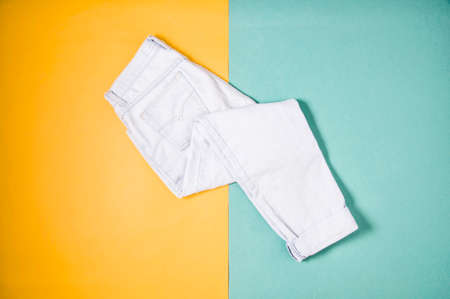 Two-tone T-shirt and denim skirt on a blue background. Stylish summer outfit. Flat lay.