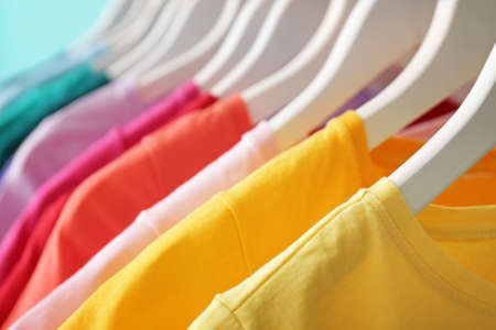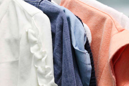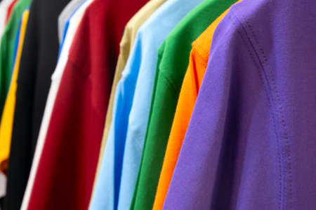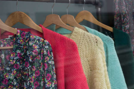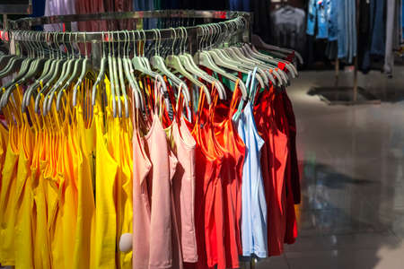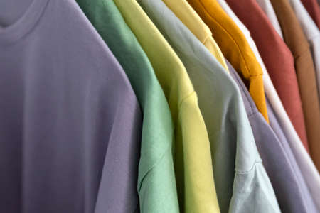 Close up shot of multi colored clothing shoulder hanging in clothing store.