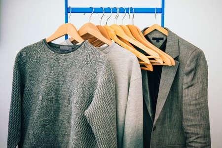 Background of shirts and overcoat hanging on a hanger. Collection of colored shirts on hangers. Close up.