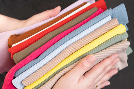 Set of knitted colorful seamless pattern. Multicolor knitting background. Texture of multicolored fabrics close up. Fabrics for sewing clothes hang in the store. Many fabrics of different materials, colors and textures. Samples of furniture fabrics.Multicolor fabric texture background.