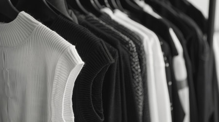 Discover the essence of style with this moody shot of hanging garments, emphasizing texture and elegance in minimalism. Perfect for fashion enthusiasts. Generated A.I.