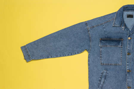 Blue denim jacket with an elongated sleeve on a yellow background. Popular casual clothing.