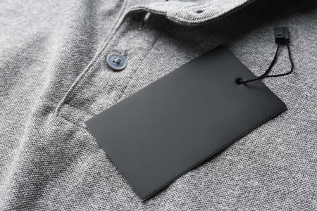 Mockup - an empty white label for text on a drawstring lies on a gray silk shirt with beautiful buttons. Close-up, label template design, print presentation mockup. Flat lay, top view.