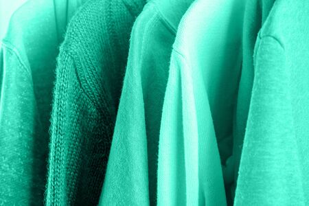 Trendy clothes of neo mint color on hangers lit by the sun beams in the showroom. Shopping, sale and fashion concept. Happy mood with a big choice of everyday outfit. Trend of 2020.