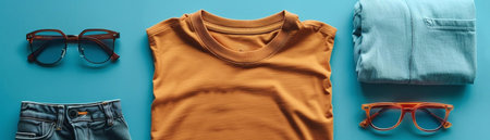 Mockup of a folded t-shirt placed surrounded by trendy aaccessories flat lay