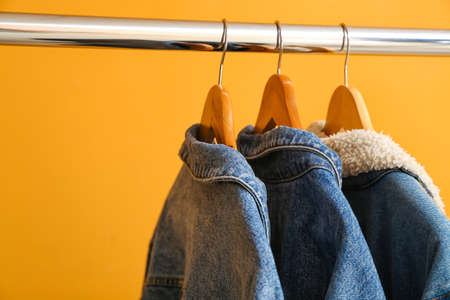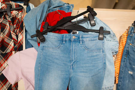 In a clothing store, fashionable jeans of different colors, sizes and models hang on hangers. shopping and sale. Choosing clothes to buy.