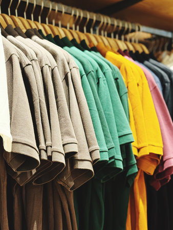 A colorful display of vibrant shirts hanging on wooden hangers. This image captures a stylish arrangement showcasing various bold colors, perfect for fashion-themed projects.