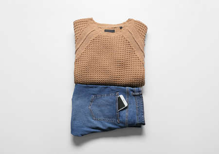 Clothes Concept. Stack of Clothing by the White Wall. Organic Cotton, Earth Tone